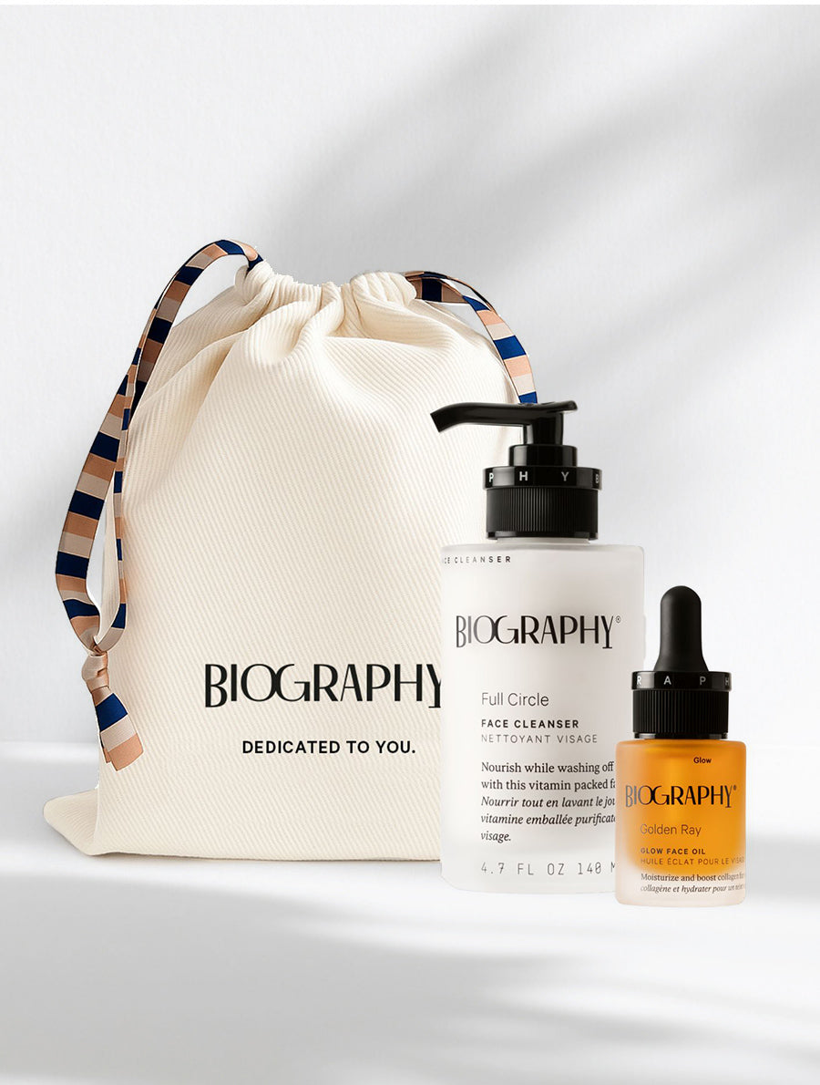 Two products designed to work as a pair. Full Circle Nourishing Cleanser begins as an oil-infused milk that transforms into a light lather, melting away makeup, sunscreen, and pollution while gently resurfacing with botanical AHAs. Follow with Golden Ray Glow Face Oil—an ultrafine oil that absorbs best on freshly cleansed, damp skin, locking in hydration and triggering collagen production at the cellular level. Full Circle creates the cleanest canvas, allowing Golden Ray to penetrate deeper and work harder. One clears the canvas, the other paints it in light. Together, they deliver the eternal good-skin day.